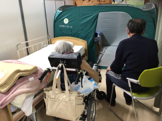 利用者様とご家族様2組にご協力いただき、宮崎市から支給していただいた、簡易パーティション、段ボールベッド、毛布を使用して、実際に一泊滞在していただく、直接避難訓練を行いました。